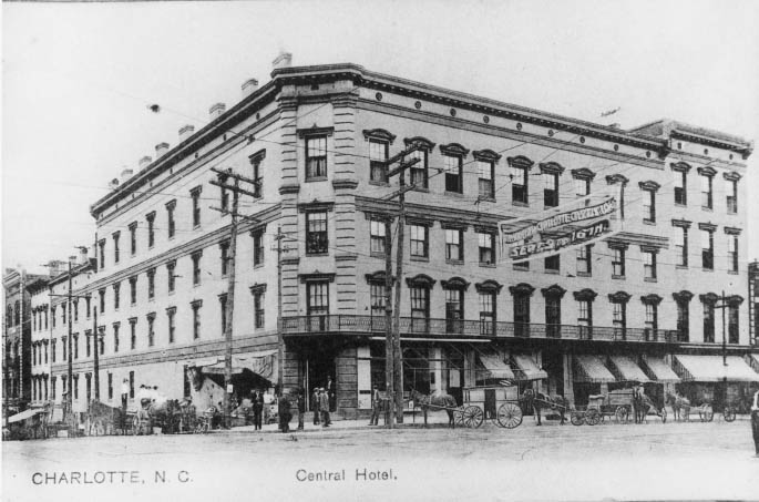 The Central Hotel was one of the longest operating hotels in Charlotte (1849-1930s.) Originally known as the Mansion House, the name was changed in the 1870s. The owners of the hotel boasted of its large, elegant ballroom. It was reportedly the largest hotel between Washington, DC and Atlanta, GA.