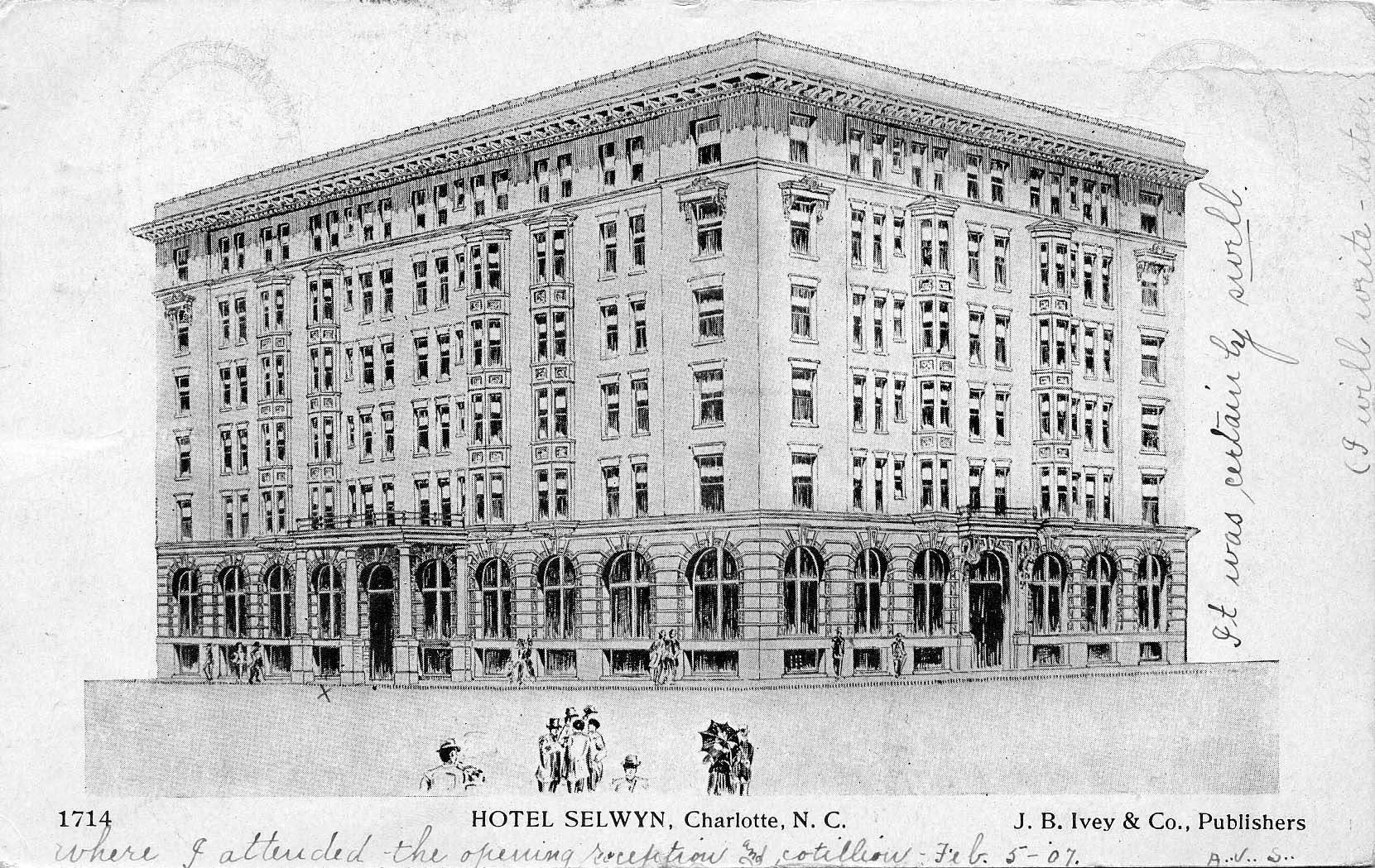 The Selwyn Hotel was located on West TradedStreet. It opened in 1907. Physical Description: 3x5 black and white Publisher: Ivey, J.B. & Company Publishers