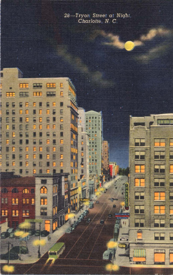 A nighttime view of Charlotte in the 1940s. Physical Description: 3x5 Publisher: Dixie News Company