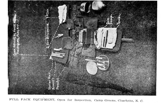 Open for inspection, this card shows the contents of a soldier's pack equipment at Camp Greene.Camp Greene was a World War I training base in Charlotte, North Carolina. Physical Description: 3x5 black and white Publisher: A. M. Simon