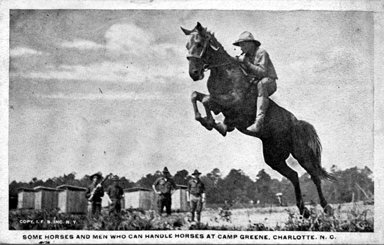 Cavalry rider at Camp Greene, a World War I training camp in Charlotte from 1917-1918. The Army stabled the horses in a large complex on Remount Road, which is how the latter obtained its name. Physical Description: 3x5 black and white Publisher: I.F.S. Inc.