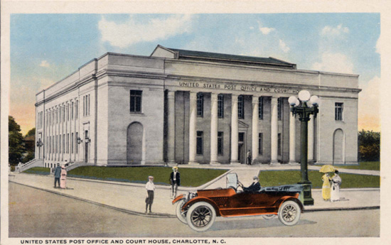 The Charles R. Jonas Federal Building is an historic two-story, limestone structure in the neo-classical design. Completed in 1915, it is located at 401 West Trade Street, in Charlotte. At various times it has served as a courthouse of the United States District Court for the Western District of North Carolina, and a United States post office. In 1975, the building was renamed in honor of long-serving North Carolina Congressman Charles R. Jonas, and was transferred to the city in exchange for land in the fall of 2005. The city lease the building to the federal government for continued use. Physical Description: 3x5 Publisher: Southern Postcard Company