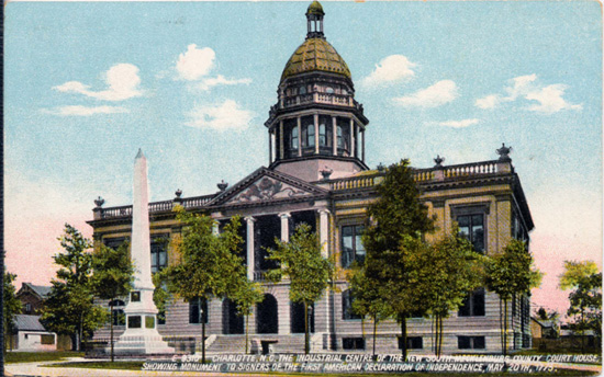 This postcard depicts the 4th Mecklenburg County Courthouse building that was erected in 1897, as well as the Independence Monument. Physical Description: 3x5 Publisher: Stone and Barringer Publishers