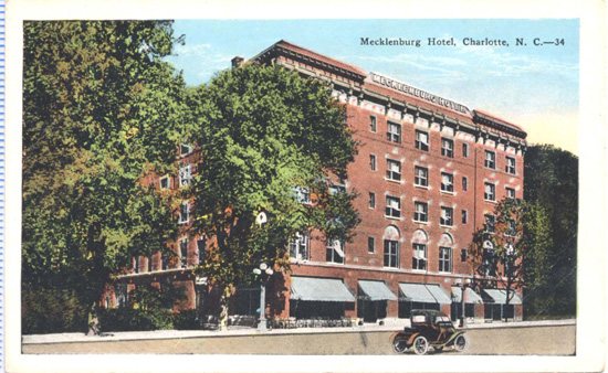 The Mecklenburg Hotel Was located at 520-524 West Trade Street. It was built in 1914 by W.C. Petty. Physical Description: 3x5 Publisher: E. C. Kropp Company