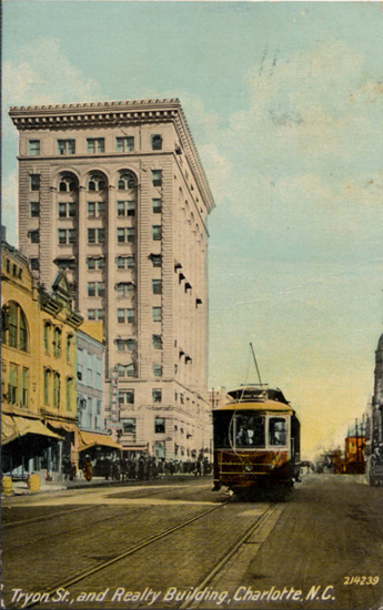 The Realty Building on Tryon Street with an ample view of a trolley car. Physical Description: 3x5 Publisher: Leighton & Valentine Company