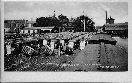 Shows men `Trucking cotton on the platform. Charlotte, NC` Physical Description: 3x5 - black & white Publisher: Stone and Barringer Publishers