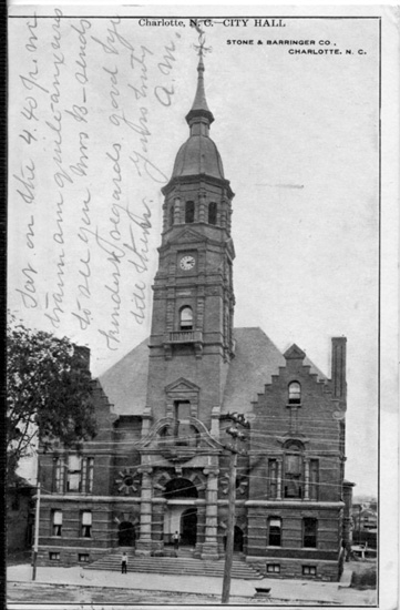 Charlotte's first official city hall was located in the 200 block of North Tryon Street. Physical Description: 3x5 black and white Publisher: Stone and Barringer Publishers