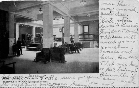 Interior shot of the Selwyn Hotel that was located on West Trade Street. Physical Description: 3x5 black and white Publisher: Unknown