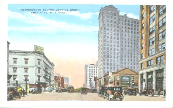 Independence Square is the intersection of Trade and Tryon Streets. Physical Description: 3x5 Publisher: E. C. Kropp Company