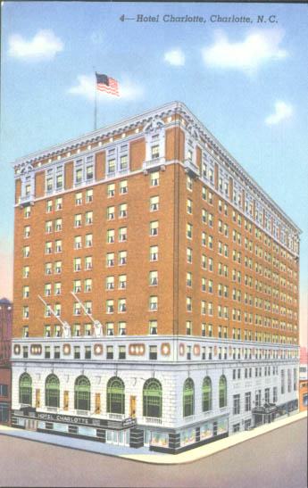 The Hotel Charlotte opened is doors in 1923. It was located at the corner of West Trade and Poplar Streets. The hotel was the most popular hotel in Charlotte. During the 1920s, the Hotel Charlotte was site of an early recording studio. Bill Monroe, the Delmore Brothers and other country music legends made their early recordings at the hotel. It was demolished in 1988. Physical Description: 3x5 Publisher: Genuine Curteich