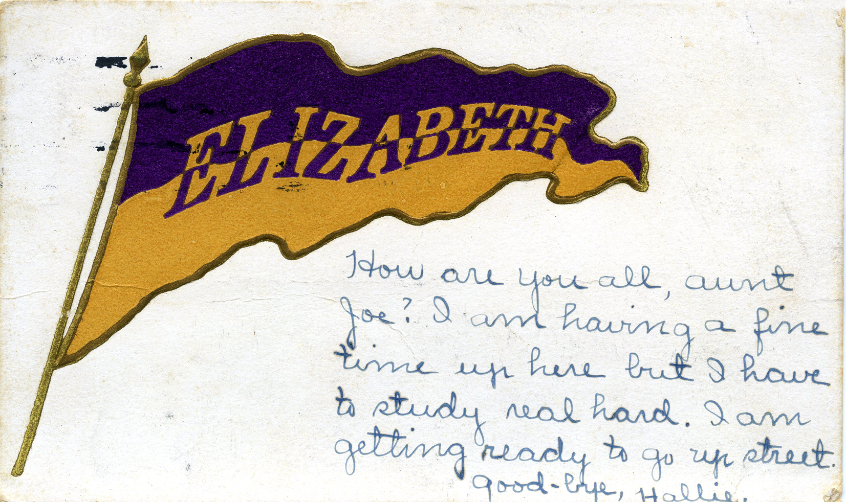 Postcard with the banner of Elizabeth College. Founded in 1896 by the Lutheran Church, the school attracted young women from across the state. It was well-known for its music conservatory. The school closed in 1915 and moved to Roanoke Virginia. It was located at the intersection of Hawthorne Lane and Elizabeth Avenue.