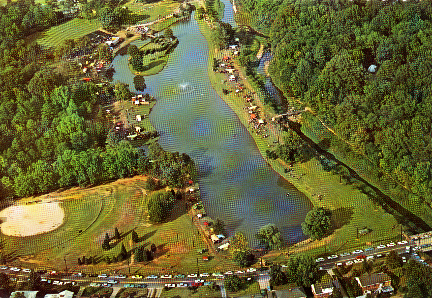 Aerial view of Festival Park which takes place in September in Freedom Park which is located in Myers Park. This postcard captures the activies in 1966, which was the first year the festival was held.