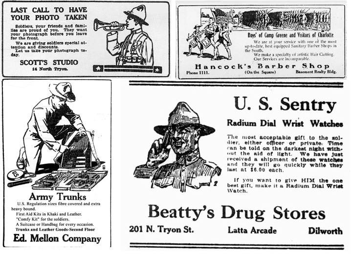 Sample newspaper advertisments aimed at Camp Greene soldiers: