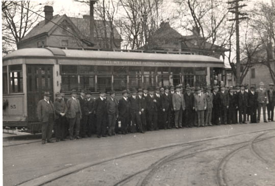 A group of dignitaries whorode the last streetcar in Charlotte posing in front of a streetcar. Taken in March 1938.Donated by Jean Ivey, wife of George Ivey, Jr. on 12 September 1974 Physical Description: 8 x 10 black and white Publisher: