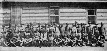 The medical supply detachment was organized at the hospital the latter part of March, 1918, supplanting a number of the men of the hospital detachment who had been on duty in the supply depots. It was owing to the need of more efficient service and realizing the fine possibilities of utilizing this station as a training post for supply men this organization was formed. Since their entrance into the field they have done splendid work. Several of the men having been awarded commissions. Those on duty with the detachment at the present time are: Standing Left to Right: Noble, Maas, Wally, Durst, Halligan, Bremer, Goldman, Walters, Baumoel, Breeland, Landers, Lytle, Miller, McRae, Logan, Scruggs, Stern, Ohlandt, Jones, Collins, N. Wilson, Dalquist, Nicol, Brill. Sitting Left to Right: Hungerford, Nichols, Fitzgerald, Pharr, Perry, Lt. Stuaffer, Capt. Darling, Hosp. Sgt. Knight, Riley, Davidson, Weaver, Van Winkle, Jr., Stevens, W. S. Wilson, Singer.