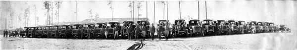 Soldiers and some vehicles at Camp Greene. There is a building under construction in the background and a hand saw with some wood in the bottom center of the photograph.