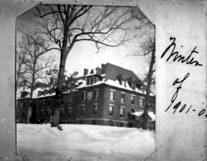 Elizabeth College covered in snow. The school was located on Hawthorne Road. It opened in 1896. This popular school for girls remained in Charlotte until 1915. Physical Description: Original in scrapbook Publisher: