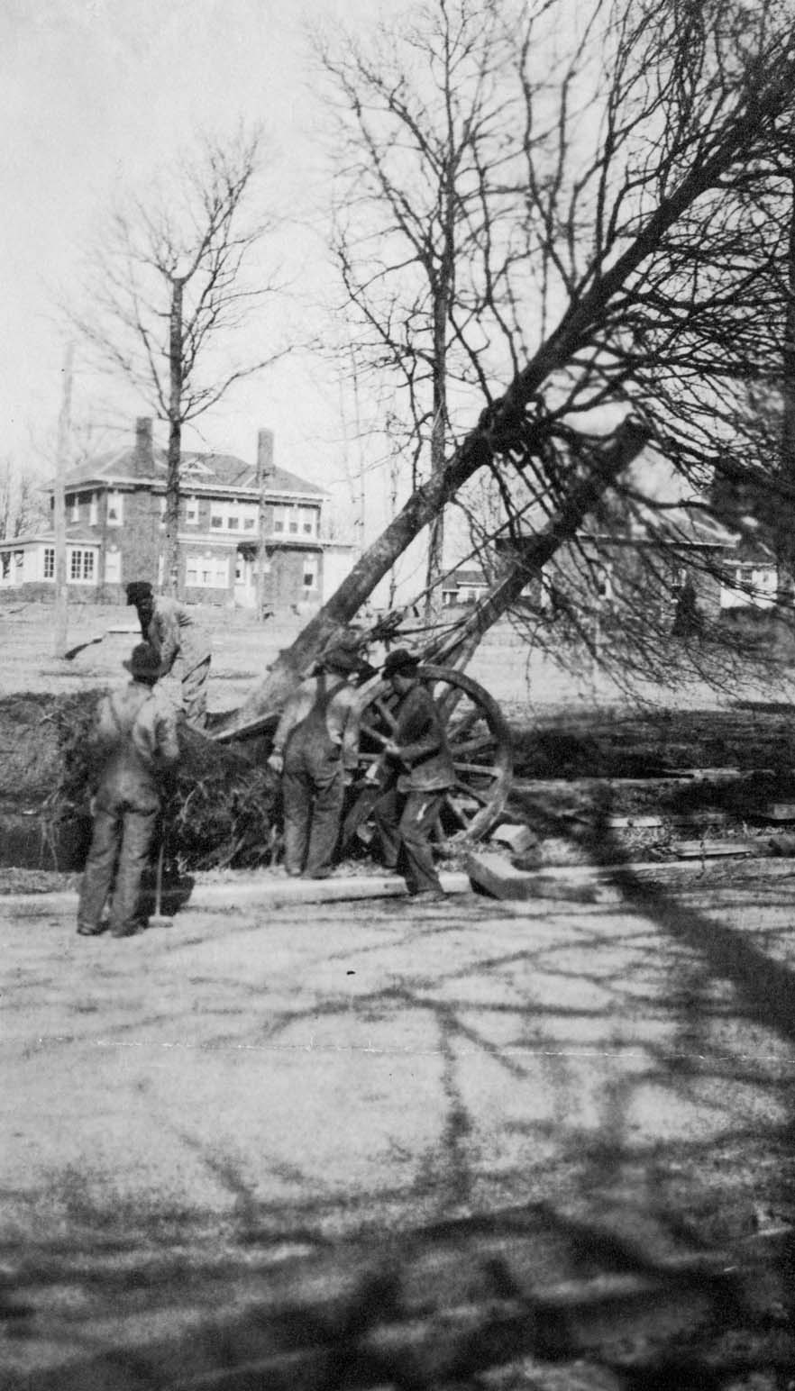 Workers planting oak tree along walk way in Myers Park. Physical Description: Slight tear in upper left hand corner has been repaired. Obvious crease at bottom of the photograph Publisher: Unknown
