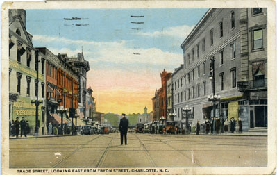 Veiw of East Trade Street from the Square. Physical Description: color postcard Publisher: Southern Post Card Company CP.2005.04.557.000