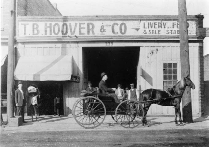 Thomas B. Hoover in one of his horse and buggies in front of his livery stable that was located at 223 E. Trade Street. (By 19ll, the address changed to 239 East Trade Street.) Physical Description: 8x10 Publisher: Unknown