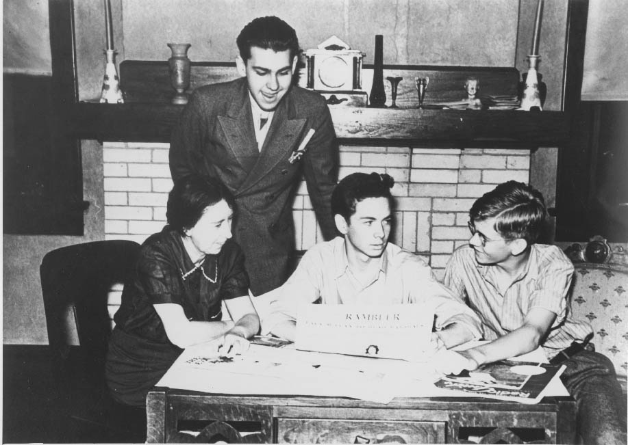 The editorial staff of the Central High Rambler in 1938. Marion Hargrove (center) was the editor. He turned the job over to Kenneth Barnsdalle (standing) and Dick Young, Jr. (right). Faculty advisor Jessie Henderson is on the left. (Hargrove went onto to become a popular writer.) Physical Description: 8x10 glossy Publisher: Unknown