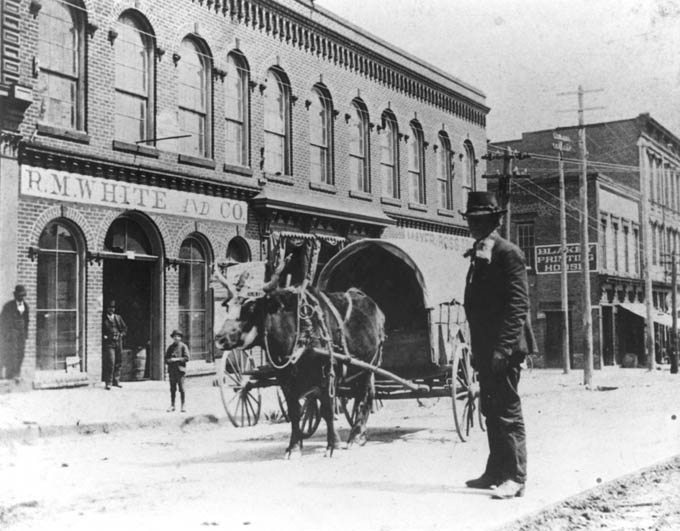 Looking East on Trade Street from the middle of the first block, one can see the R.M. White Ind. Co., a wholesale and retail grocer at 39 East Trade Street. The individual in the street is unknown. Physical Description: 8x10 glossy Publisher: Unknown