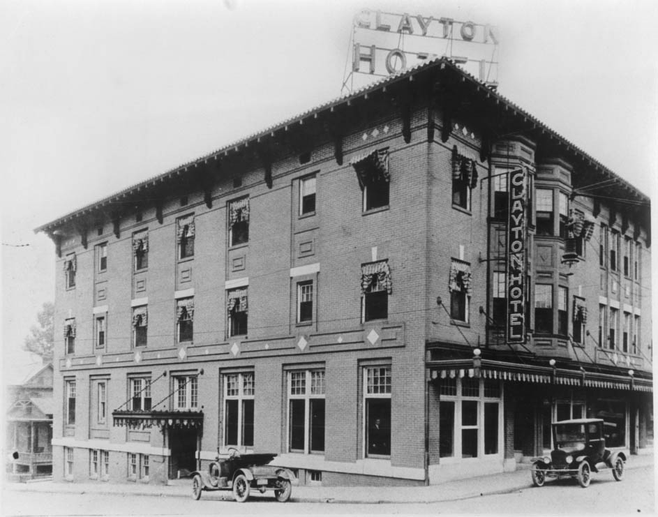 The Clayton Hotel was located at the northeast corner of Church and Fifth Streets. Built in 1913, the hotel offered one hundred rooms and fifty baths. Merton C. Propst was the owner. The Clayton Hotel was demolished in the mid-1970s to make room for a parking lot. Physical Description: 8x10 glossy Publisher: Unknown