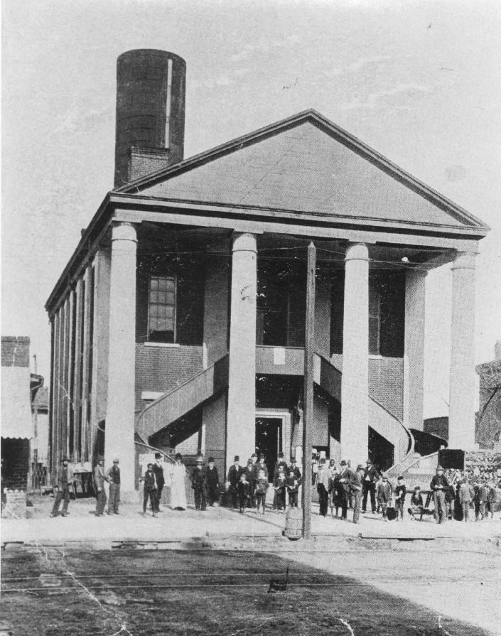 The Third Courthouse was located at Church and Trade Streets. Each of the tall, white columns were made from a single pine tree then stuccoed after being milled. It gave the appearance of marble. When the courthouse was torn down, no one recalled this fact, and the workers were surprised to discover perfectly preserved trees beneath the stucco. It was torn down in 1898. Physical Description: 8x10 glossy Publisher: Unknown