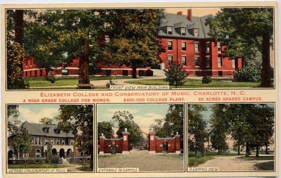 Four scenes of Elizabeth College, a private womans school at the intersection of Elizabeth and Hawthorne. They include the Main Building, which is now the Presbyterian Hospital: the Gerrard Conservatory of Music, the Main Gate and a view of the campus. Physical Description: 3 x 5 postcard Publisher: Stone and Barringer