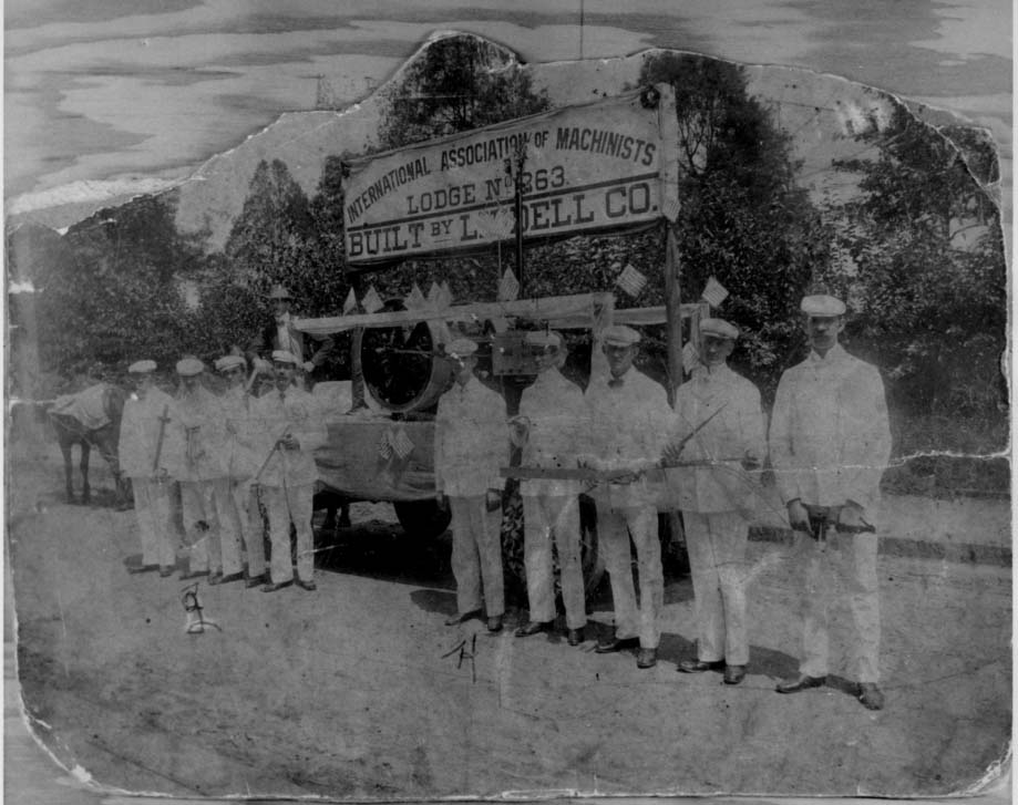 The International Association of Machinists, Lodge 263 Drum and Bugle Corps pose in front of their parade float built by the Liddell Company. Physical Description: 8x10 glossy, 4x5 negatives - 3 copies Publisher: Unknown Image Negative: 1 Print: 1 Donor: Unknown