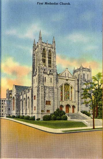 The First Methodist Church formed in 1927 with the merger of Tryon Street Methodist and Trinity Methodist. This particular building was completed in 1927 at a cost between $8000,000 and $900,000. It houses a four-manual organ, tower chimes, a 1560 seat auditorium and a educational building. Physical Description: 3 x 5 postcard Publisher: